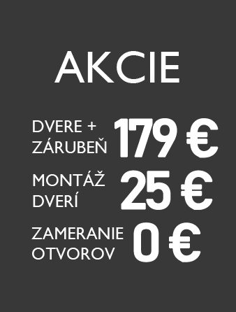 Využite naše aktuálne AKCIE na Interiérové dvere a zárubne na mieru od 179,-€. Interiérové dvere a zárubne montujeme už za 25€/ks a za zameranie sa u nás neplatí.